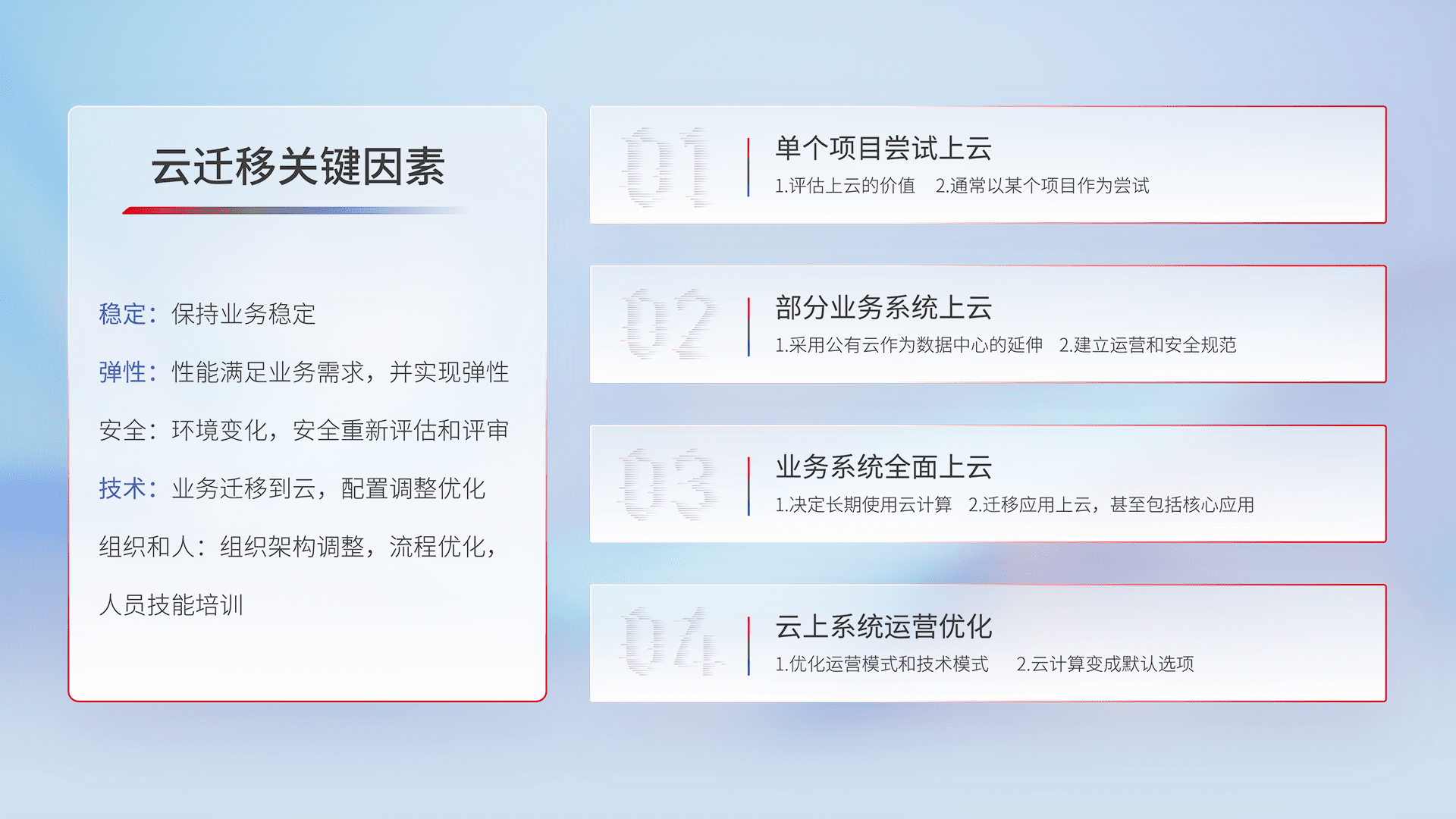 结合实际业务,,,,从规划设计、、、云平台选型、、、、云原生改造、、、数据迁移、、集成交付,,,迁移全过程为客户识别最佳上云路径,,,做好风险识别管理,,,设计网络架构、、、身份权限、、安全审计合规、、操作审计、、日志审计、、、监控告警策略、、多站点容灾设计等,,,,对云上基础设施进行整体规划,,,,提升IT治理水平,,,以满足弹性、、、、高可用、、、高性能的需求。。。。