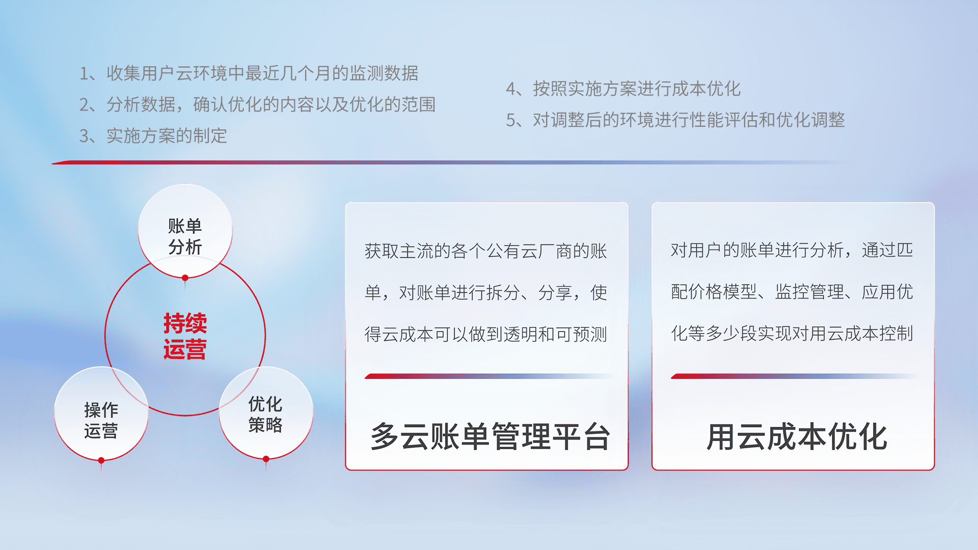 通过多云纳管,,,以统一的资源数据模型把客户的云资源进行抽象和封装,,,,进而实现对多云资源的统一操作,,,保障云资源管理的可靠性、、、、稳定性与可用性。。。。量身定制化运维内容,,,配置、、开发运维、、补丁管理、、、、备份、、监控、、认证和访问管理、、审计和日常巡检等,,保障在用云过程中的可靠度,,稳定度以及高可用率。。。
